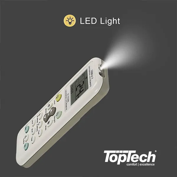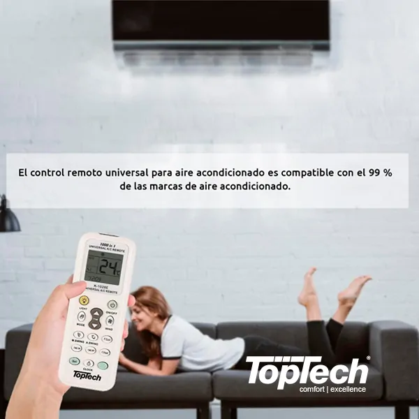El Control Universal Toptech K-1028E es una solución práctica y confiable para reemplazar controles originales de aire acondicionado dañados o extraviados. Es compatible con más de 1,000 modelos y marcas de equipos de aire acondicionado tipo split pared, ventana y piso techo.